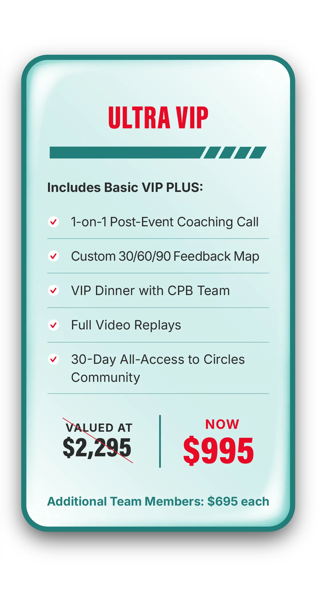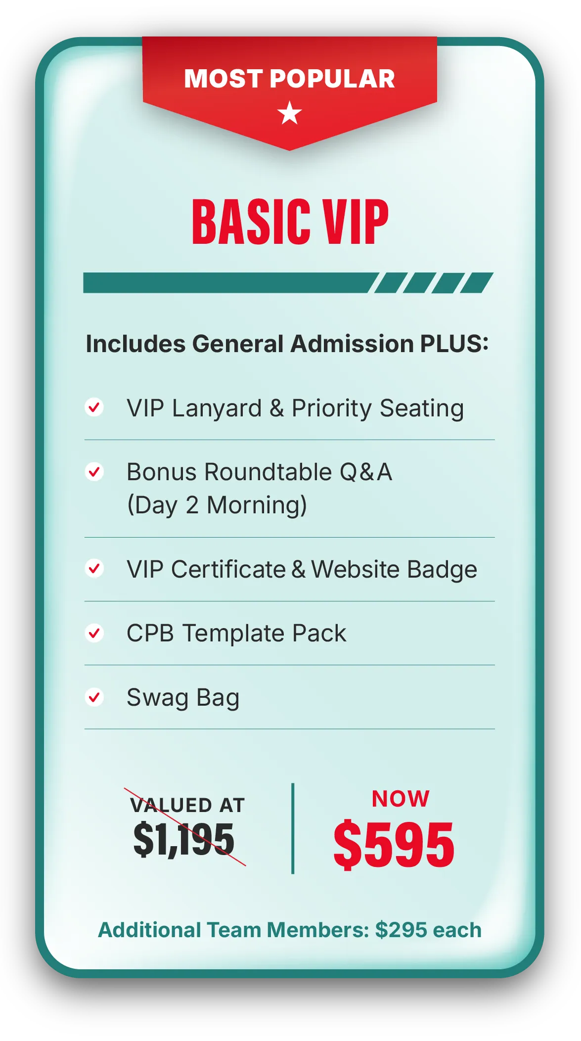 General Admission includes the core two-day training and materials. VIP and Ultra VIP levels give you extra support like recordings, templates, coaching calls, a recognition toolkit, and exclusive access to the CPB team. You’ll walk away with even more clarity, confidence, and implementation-ready systems.